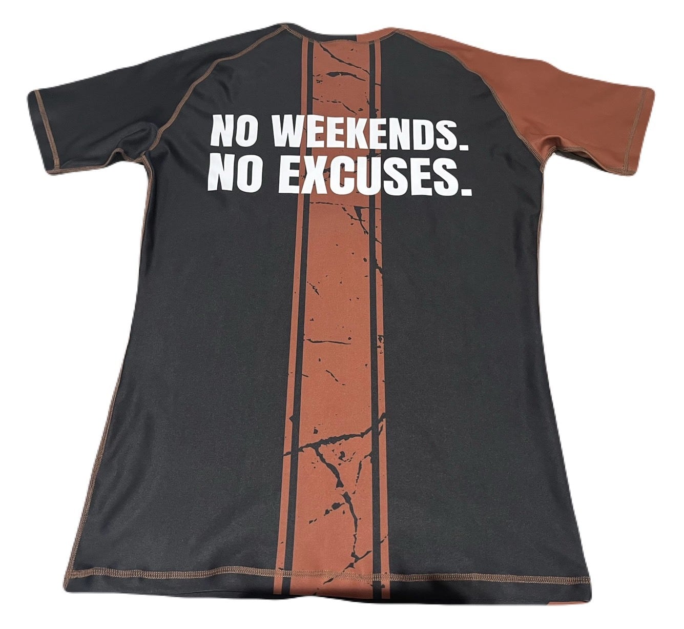 デザイン:全体 フロントにブランドロゴ、バックにNO WEEKENDS. NO EXCUSES.